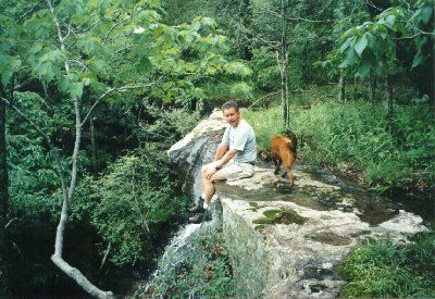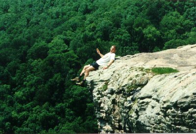 This is Dick (and his dog Scout) on Hawk's Bill Crag. I still have a picture of Hawk's Bill Crag (a view similar to this one) that I tore out of Bicycling Magazine several years ago, with a humorous caption...something like "sadly, Gordon's weight was just enough to cause the billion-year-old granite formation to collapse." |