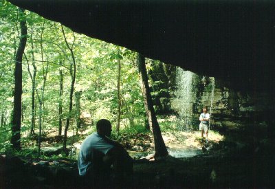 For this I put the camera on a rock and used the timer. There's a nice camping spot under this section of the waterfall. There was an occupied sparrow's nest under there too, and I got a picture of mama bird delivering a worm, but it's hard to see so I didn't scan it. |