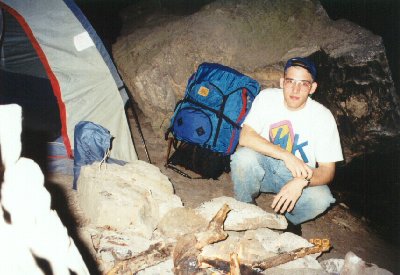 This is me hiking the Butterfield Trail solo last month (April 3, 1999). I think it's the first time I ever started a hike after sunset. And in the rain. But I camped under a big overhang, plus the rain stopped. |